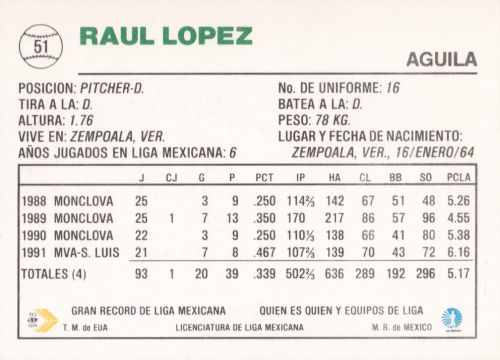 Baseball card di Raul Lopez del 1992, prodotta dalla Liga Mexicana