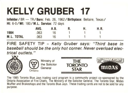 Baseball card di Kelly Gruber del 1985, del set Toronto Blue Jays Fire Safety