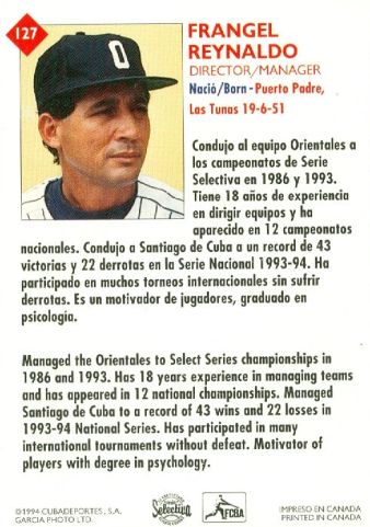 Baseball card di Frangel Reynaldo del 1994. prodotta da Cubadeportes
