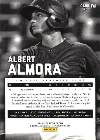 Baseball card di Albert Almora del 2012, del set Extra Edition, prodotta da Panini