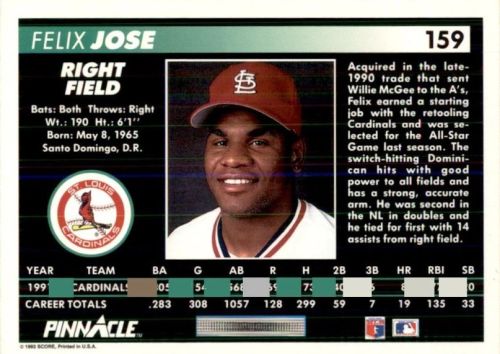 Baseball card di Felx Jose del 1992, del set Pinnacle, prodotta da Score