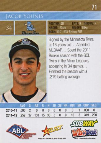 Baseball card di Jacob Younts del 2012, prodotta da Select Australian Baseball League