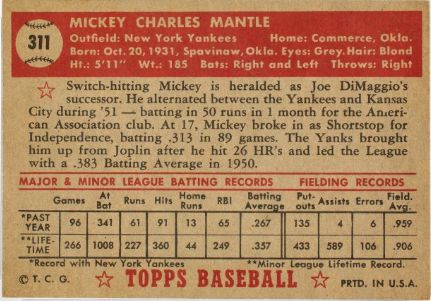 Bowman fu il principale produttore di card da baseball dal 1948 al 1952. Nel 1952, Topps iniziò a produrre anche grandi set di cards, pubblicandone la prima, creata dal dipendente Topps Sy Berger e dall'editore Woody Gelman. Il set è considerato dai collezionisti il primo set di baseball cards moderno grazie alle nuove foto a colori, agli autografi in facsimile e all'inclusione di statistiche e biografie stampate sul retro. Il set Topps del 1952 è il set del dopoguerra più ricercato tra i collezionisti a causa della scarsità della card da rookie di Mickey Mantle, la prima card di Mantle emessa da Topps. Sebbene non sia la sua vera card da rookie (quell’onore spetta alla sua card Bowman del 1951), è comunque considerata la card definitiva da possedere del dopoguerra.