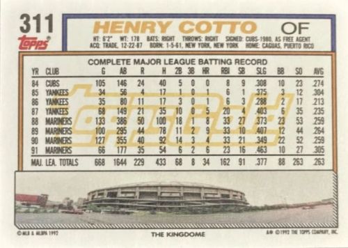 Baseball card di Henry Cotto del 1992, del set Topps Gold, prodotta da Topps