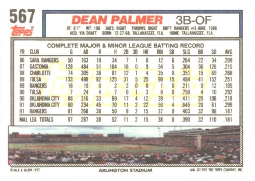 Baseball card di Dean Palmer del 1992, del set Gold Parallel, prodotta da Topps